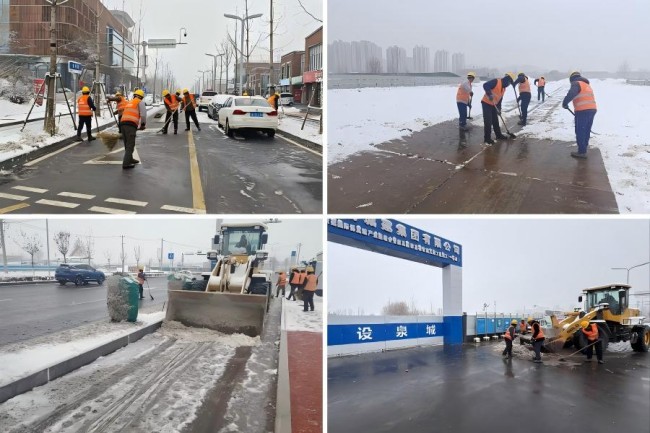 面对雪情,城建一公司起步区国博城项目部紧急组织职工应急值班,党员干部带头驻守一线,密切关注雪情变化,巡查安全设施与道路状况,预防夜间交通安全隐患。同时,项目部集结扫雪突击队,派出装载机,配备铁锹、扫帚等工具,清扫项目周边的主次干道、人行步道等区域的积雪积冰,为周边居民、过往车辆提供了安全整洁的出行环境。