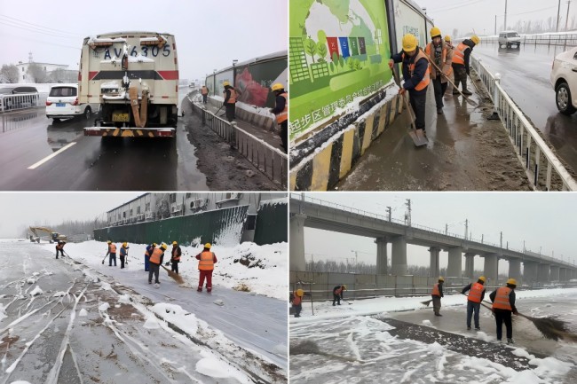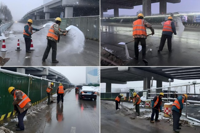 城建六公司黄岗路穿黄隧道项目部及人行天桥项目部针对309国道辅路、幸福寺路等处的积雪结冰情况,迅速部署,立即组织工人开展扫雪除冰作业。党员干部和青年职工带头,分工协作,高效清除通行隐患,保障路段通畅,以快速响应和务实行动守护群众平安,展现了国企为民服务的责任与使命。